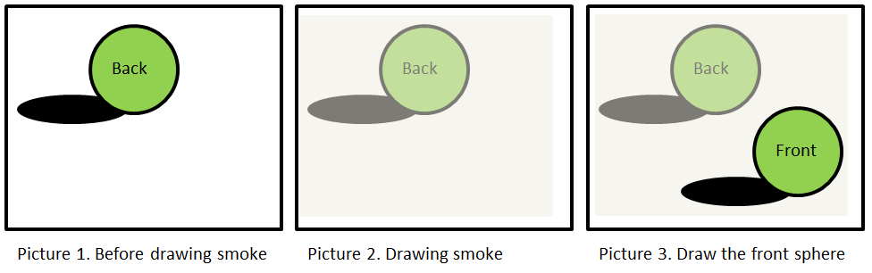 Because of how blending works, the smoke is being blended with the source pixels (Picture 1), which already has correct colors drawn. Of course the brute force solution is draw everything in back to front order. But that implies that we do the position sorting in the CPU. However smoke’s irregular shape makes comparing unfeasible and it still doesn’t solve the problem of rendering spheres surrounded by smoke.