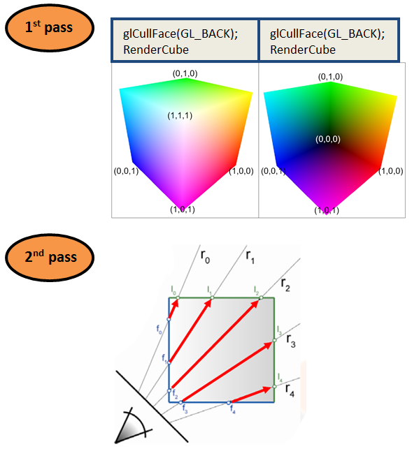 First I need to need explain the rendering process of the smoke in my program. I used the Two Pass Ray Casting technique, and the following diagram briefly illustrates the method: