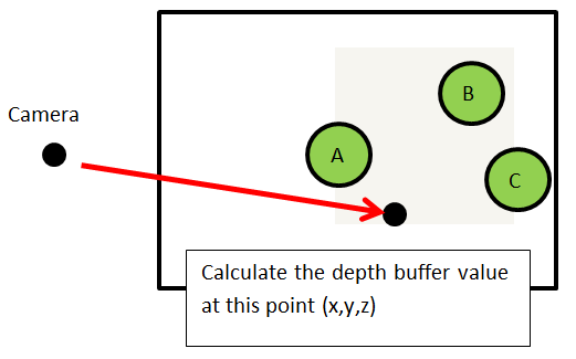 I defined a function CalcDepthValue to calculate the depth buffer value. The actual calculation is pretty straightforward, but it took a lot of googling XD. We take our vertex that is already in object space and multiply it with the ModelViewProjection Matrix. We then do a perspective division and convert the range from [-1,1] to [0,1] so that it is in proper depth buffer range (which by default is between 0,1, but you can change in using glDepthRange).